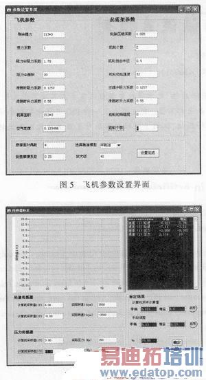 点击界面上的“飞机参数设置”按钮可进入飞机参数设置界面,界面左上方为飞机参数的设置,右上方为起落架参数设置,界面下方可对摩擦面对偶数,刹车摩擦系数设置及跑道模型等的设置。设置完成后点击“设置完成”按钮退出该界面,返回到初始界面,完成其他参数的初始化。飞机参数设置界面如图5所示。