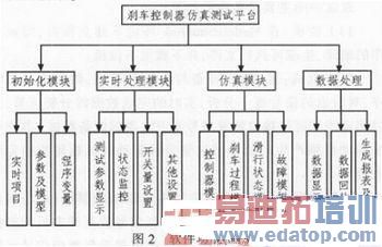 刹车控制器测试软件要完成系统参数设置,提供数据采集、显示、存储与回放功能,检测控制器的状态、刹车系统综合性能及各附件性能指标,刹车控制器模型的模拟。满足系统要求,方便用户使用,同时软件系统必须具有可靠性、可扩展性及应用性,测试软件采用模块化设计,包括初始化模块、实时界面模块、仿真模块与数据处理模块。功能模块结构图如图2所示。