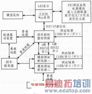 测试平台兼顾飞机刹车系统内外场仿真及测试,主要组成包括:上位机、刹车控制器测试箱、模拟测试断线箱一、模拟测试断线箱体二、刹车系统检测控制器、轮速驱动箱及电源箱,设备功能齐全。其系统组成架构如图1所示。