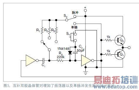 R1到R3的值设定了非稳态频率,或单稳脉冲宽度。在第二个门的输入端有220kΩ的电阻,用于当门电压低于地电压,或比VDD高0.6V时,限制电容的泄漏电流进入门输入端。单稳脉冲产生大约1/(2.2RC)的频率,而门的阈值电压决定了单稳的脉冲宽度,即大约0.7RC到1.1RC。