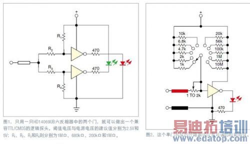 本设计实例描述了一种简单的方法,可以用一只无缓冲CMOS六反相器HD14069UB(参考文献1),做出四种测试件:一个有良好定义逻辑电压窗口的逻辑笔,输入阻抗约为1MΩ;一个开路测试仪,上限电阻可以从几十欧到几十兆欧;一个单脉冲或脉冲串注入器或简单的信号发生器;还有一个是高阻音频探头。使用一只4069中的六个反相门、两或三只电阻,以及少许无源元件, 就可以做出这些测试仪器。