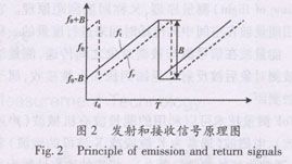 FMcw 雷达通过发射频率调制的连续波信号,从回波信号中提取目标距离信息。FMcw分为线性调频和非线性调频(如正弦波调频)两种。使用非线性调频方式时,每个目标产生的差拍频率不唯一,一般只适用于单目标的场合,如雷达高度计等;线性调频方式适合于用FFT算法测量频率,应用最广。这种方式使每个目标产生的差拍信号都是单一频率,但其对线性调频的线性度要求很高,比较常用的调制波形是三角波和锯齿波,物位仪表常用锯齿波高频方式。FMCW 雷达发射和接收信号的原理如图2所示。