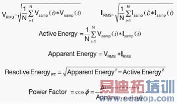 能耗测量计算利用由 ADC 收集的电压和电流样本来完成。由下式可见,为了计算有功能耗 (active energy)、无功能耗 (reactive energy) 或表观能耗 (apparent energy),MCU 必须具备针对诸如平方根、平方和除法等常用函数的优良数学库。