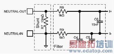 在辅助计量表中,可以采用简单的电阻分压器作为电压传感器。应选择正确的电阻值以对交流电源电压(通常为 230 VAC 或 120 VAC)进行分压,从而适合模数转换器 (ADC) 的输入范围。图 3 中所示的电阻分压器电路可用于将 230 VAC 的交流电源电压分压至大约 350 mV RMS(其峰值为 495 mV),然后再馈送至 ADC 的正输入3。电阻器具有最大额定电压,假如超过此电压就会在电阻器本体上引起电弧。如果采用串联的分立电阻器(R1、R2 的 R3)替代单个 1MΩ 电阻器,则允许使用标准电阻器,而不会超过其最大额定电压。