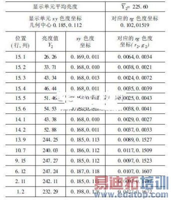 表1为检测结果(以蓝色为例),其中亮度值Y1为相对亮度,正比于最大亮度255;色度坐标为(r1,g1)。