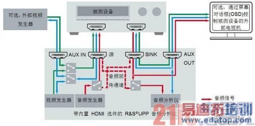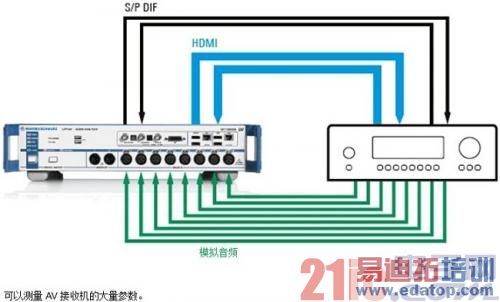 如果分析仪以相反方向输入音频/视频测试信号到被测设备,例如通过S/P DIF接口,分析仪可以通过模拟输出或通过HDMI接口,接收和测试相关输出信号。