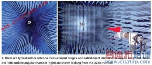 在传统的远场天线测试场中,发射和接收天线分别位于对方的远场处,两者通常隔得足够远以模拟想要的工作环境。AUT被距离足够远的源天线所照射,以便在AUT的电气孔径上产生接近平面的波阵面。远场测量可以在室内或室外测试场进行。室内测量通常是在微波暗室中进行。这种暗室有矩形的,也有锥形的,专门设计用来减少来自墙体、地板和天花板的反射(图1)。在矩形微波暗室中,采用一种墙面吸波材料来减少反射。在锥形微波暗室中,锥体形状被用来产生照射。