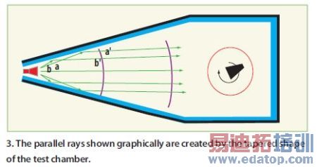 锥形暗室没有消除镜面反射。锥体形状使镜面区域更接近馈源(源天线的孔径),因此镜面反射成为照射的一部分。镜面区域可以用来通过形成一组并行射线入射进静区,从而产生照射。如图3所示,最终的静区幅度和相位锥度接近自由空间中的期望值。
