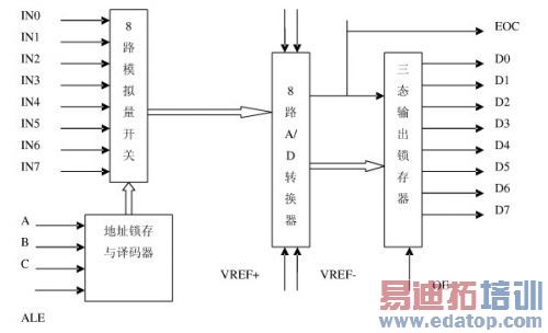 地址输入和控制线:4条 。ALE为地址锁存允许输入线,高电平有效。当ALE线为高电平时,地址锁存与译码器将A,B,C三条地址线的地址信号进行锁存,经译码后被选中的通道的模拟量进转换器进行转换。A,B和C为地址输入线,用于选通IN0-IN7上的一路模拟量输入。数字量输出及控制线:11条 。ST为转换启动信号,当ST上跳沿时,所有内部寄存器清零;下跳沿时,开始进行A/D转换;在转换期间,ST应保持低电平。EOC为转换结束信号。当EOC为高电平时,表明转换结束;否则,表明正在进行A/D转换。OE为输出允许信号,用于控制三条输出锁存器向单片机输出转换得到的数据。OE=1,输出转换得到的数据;OE=0,输出数据线呈高阻状态。D7-D0为数字量输出线。