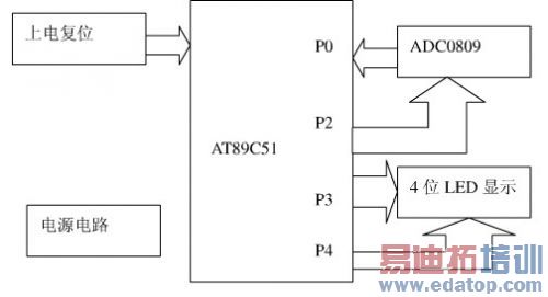 采用NS公司的分辨率为8位的逐次比较型的高精度的模数转换器ADC0809,ADC0809是带有8位A/D转换器、8路多路开关以及微处理机兼容的控制逻辑的CMOS组件。它是逐次逼近式A/D转换器,可以和单片机直接接口。把采取的电压进行处理然后通过单片机的P口送到单片机然后经过程序处理,由LED电路把电压数值显示出来。单片机加上外围的串口显示电路由74LS245和数码管三极管组成。