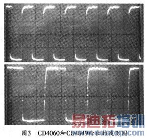 本系统的高压产生电路如图2所示。各芯片电源电压统一为12 V。系统采用CD4060和石英晶体来产生3.6864 MHz的方波,再经过32分频后将115.2 kHz信号输入到CD4013的D触发器。然后通过两分频产生相位相差180°的57.6 kHz信号,来确保驱动波形的对称性,且不会有直流分量。最后再输出给并联连接的CD4049。由于场效应管的栅源电容一般较大,因此需要大的驱动电流减小充放电时间来提高驱动场效应管栅极能力。CD4060和CD4049的输出端波形如图3所示。