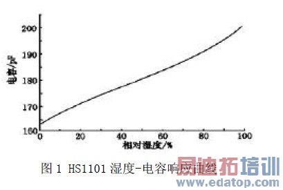目前, 生产湿敏电容的主要厂家是法国Humirel 公司。它生产的HS1101 测量范围是0%~100%RH,电容量由162PF 变到200PF,其误差不大于±2%RH;响应时间小于5S;湿度系数为0.34PF/℃;年漂移量0.5%RH/年,长期稳定。图1 为HS1101 湿敏电容的湿度-电容响应曲线。