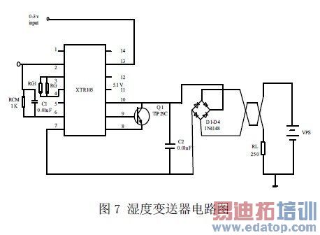 本文采用了美国BB 公司生产的XTR105 作为湿度变送器的芯片,把湿度传感器输入的0~3V 电压转换为4~20mA 的电流信号输出。其电路如图7 所示。