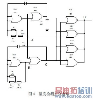 需要指出的是,图3 所示的湿度传感器零点电容比较大,灵敏度不够高,湿度从0%~100%RH,电容的变化量不超过30~50PF。为此,最好将零点电容消除掉,在实际设计中我们用两片CMOS4001 集成电路对图3 进行改造,具体见图4。
