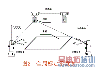 在实际应用中,通常是将多个视觉传感器组成一个视觉检测站,每个传感器首先计算出被测点在当前的传感器坐标系中的坐标,然后将所有视觉传感器坐标系汇聚在系统坐标系下,从而完成丈量。系统的工作主要建立在摄像机模型和立体视觉传感器三维丈量模型的基础上。为了得到被测点在车身定位坐标系中的坐标,需要以标准坐标系为中介,把被测点在传感器坐标系中的坐标转换到被测点在车身定位坐标系中,这就需要把传感器坐标系、车身定位坐标系与标准坐标系同一起来,称为中介坐标同一法。完成上述工作是通过局部标定和全局标定的过程来实现的。局部标定是利用透镜透视原理,标定出从世界坐标系到传感器三维坐标系的12个外部参数;全局标定采用的是中介坐标系方案(图2),通过采用靶标,求出丈量传感器所对应的传感器坐标系到经纬仪坐标系的转换矩阵,完成坐标系的同一。