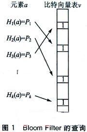 如果要知道一个元素a是否在集合S中,可以参照图1对其进行k个hash变换,并查询v中对应的元素是否为1。如果k个对应元素均为1,就断定a在集合S中。
