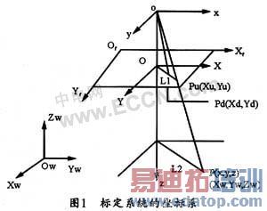 摄像机通过成像透镜将三维场景投影到摄像机二维像平面上,这个投影可用成像变换(即摄像机成像模型)来描述。摄像机成像模型分为线形模型和非线性模型。针孔成像模型就属于线形摄像机模型,本文就讨论在这种模型下,某空间点与其图像投影点在各种坐标系下的变换关系。图1所示为三个不同层次的坐标系在针孔成像模型下的关系。其中(Xw,Yw,Zw)为世界坐标系,(x,y,z)为摄像机坐标系,XfQfYf为以像素为单位的图像坐标系,XOY为以毫米为单位的图像坐标系。
