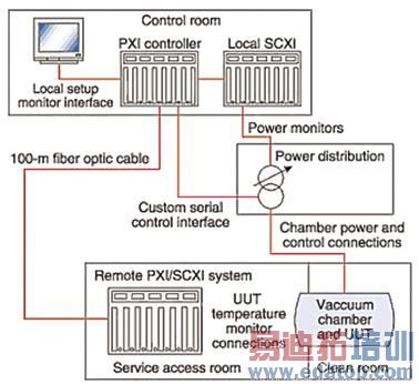 洛克希德马丁的工程师们与NI 公司合作,设计出了双机柜的基于PXI 的系统(请看图2),它可以控制热真空室,并且进行必要的测试。然后,洛克希德马丁公司委托Cal-Bay Systems 公司来实现他们的设计。