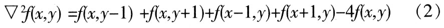 如果把它用加权矩阵来表示则可表示成图1左侧所示的卷积模板。由于数字图像中离散信号的特点,在连续情况下能获得的精确零点这时可能无法全部检测出来,故拉普拉斯算子输出为零的点并不能表示出完整的目标边缘。为此,在设计中定义边缘为满足以下两个条件的像素点的集合:①拉普拉斯算子的输出为正;②在其8邻点存在拉普拉斯算子的输出为负的点。