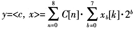 式中xb[n]表示x[n]的第b位,而x[n]也就是x的第n次采样。于是,内积y可以表示为: