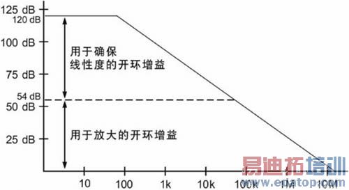 例如,假设放大器的开环增益为120dB,并且带宽足够大,允许放大器在增益为500倍所对应的频率下正常工作。500倍的增益大约相当于54 dB,所以放大器的54dB开环增益用于提供增益。剩余的66dB为开环增益裕度,用于确保线性度,如图1所示。