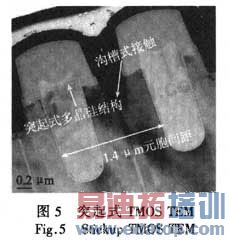 当相邻单位元胞尺寸不断缩小后,尤其在设计栅极氧化膜较薄的器件时,在传统的TMOS工艺中,源区注入会穿透栅极侧壁影响器件性能。采用突起式结构可以有效地避免刻蚀工艺及源区注入对较短沟道器件的间接影响,消除了器件穿通的风险,保证了器件的稳定性能和可重复性。