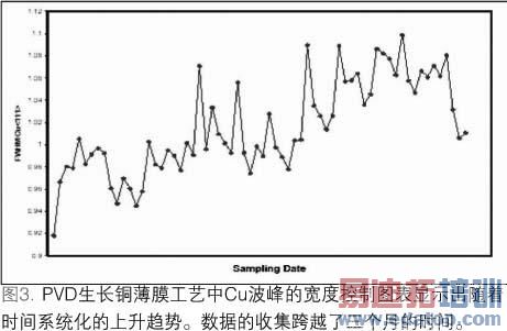 因为受硅片产出量的限制,在这些设备上进行残留应力的测量并不现实。剩下的相位,晶粒大小和织构都是可测量的参数。我们所面临的挑战是如何将图1和图2所示的庞大图形数据量精简为几个相关参数,而这些参数可以加入统计过程控制(SPC)图表。在这些参数当中,晶粒尺寸是最容易获得的,对于给定的相而言,衍射峰之间的宽度与材料晶粒的平均尺寸成反比。另外两个参数的测量则面临着较大的挑战,因为一般而言,它们依赖于精通X射线衍射理论和应用的个人对图形数据进行个别的诠释。