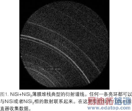 相分析要求事先了解感兴趣的相。一种自动化的峰拟合算法用来获得曲线中每一个峰的位置和强度值。将实验峰值的位置与感兴趣相的谱线作对比,来确定该相是否存在。另外,曲线中不能被匹配的峰意味着更多的相存在。例如在图2中,如果取样程式认为在测量的硅片上只存在镍单硅化物,尽管事实上相的鉴定需要手工完成,但多余的峰(来自于NiSi2)仍然会被软件标记。为了测量不同相的比例,一种针对多相系统的应用遵循了这样的原理,即一个独立相衍射峰的强度(一级近似)与薄膜中对应相的数量成比例。