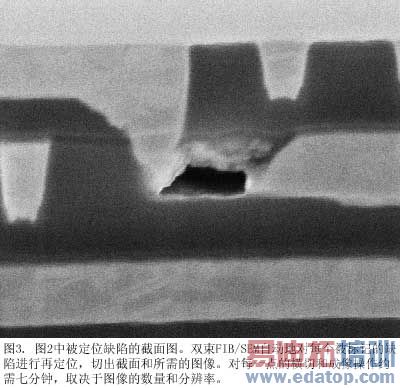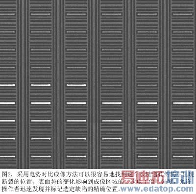 分析处理分两个阶段。第一阶段,操作员使用电势对比成像(voltage contrast imaging)来识别和精确定位失效位置。电势对比存在于SEM图像中,是由样本表面的电势差引起的。电荷由扫描电子或离子沉积下来,并积累在未接地的非导体表面或导体表面。积累的电荷改变了表面电势以及用来SEM成像的二次电子信号的强度。电势对比图给我们提供了一种快速找出微电子电路短路与开路的方法。缺陷一旦定位,双束FIB/SEM就用FIB自动研磨一个基准标记。在这个研究中,我们可以定位开路缺陷(>100 M-Ω)和短路缺陷(<50 K-Ω)的最大速率约为每小时10处。缺陷的尺度范围从小至50nm以下到大至40,000平方微米。