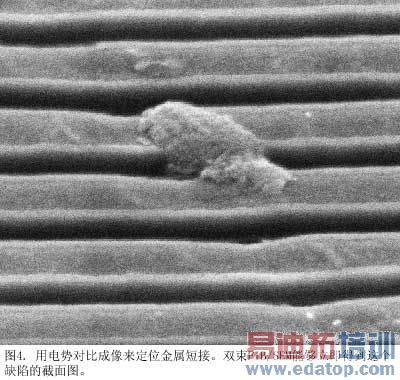 短流程法不仅能探测短路,而且还能探测开路。一般而言,开路(<2 min/site)比短路(<15 min/site)定位更快。图4说明了怎样使用电势对比和FIB技术来隔离金属短接。