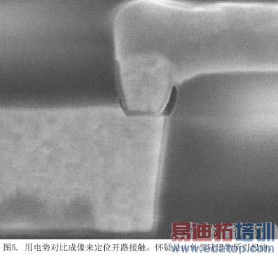 FEOL CV完成接触的扩展特性,这种情况下,金属与局部互连线接触。图5显示了一个开路接触的FIB截面,怀疑是由外部残留物所导致的。尽管这幅截面图中电学断开不是很明显,但是用于定位缺陷的电势对比成像提供了确凿的证据,表明这个接触是开路的。