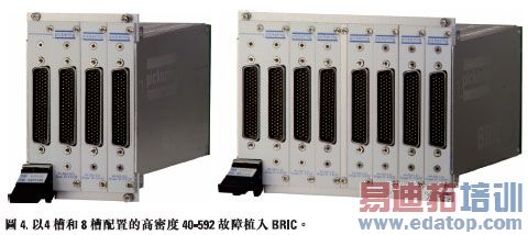 40-592 是一种密度很高的故障植入 BRIC 解决方案(图 4),处理中短距离信号。该型号基于仪器级、涂钌的磁簧继电器(reed relay),具有 1A (150Vdc/100Vac,20W) 开关容量和很长的工作寿命。它可采用 4 槽和 8 槽机械形状系数。40-592 可被指定成多种矩阵尺寸,以便透过只安装某些开关模块来适应所预期的应用。总共有 24 种配置可供 40-592 使用,具有 2 引脚或 3 引脚中断选项。对于 2 引脚中断选项,最大矩阵尺寸是 248 x 8,3 引脚中断选项是 160 x 8。简单地把模块以雏菊链形式连接起来,就能建造出更大的矩阵。