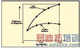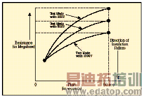 Ep-n-相-地电压额定值步进电压测试 步进电压测试包括在不同的电压设置下的阻抗测试。在这种测试中,对每种电压施加相同的时间周期(通常为60秒),然后画出绝缘阻抗曲线。通过施加步进增长的电压,绝缘阻抗问题会暴露于提高的电压下,能够显现出一些绝缘上的缺陷信息,如针孔、有形损坏,或者脆度等。良好的绝缘应该能够承受电压的增长,在不同的测试电压下,其阻抗应该保持基本相同。另一方面,尤其是在高压时,材料恶化、破裂或被污染的绝缘材料也能承受增长的电流,只是导致绝缘阻抗的降低。这种测试并不受绝缘材料、设备电容和温度的影响。由于该项测试需要更长的时间,所以,只有在绝缘抽查测试结果不确定时才进行该项测试。抽查测试处理的是绝对阻抗(单一读数)随时间的改变,而步进电压测试是查找阻抗随不同的测试电压变化的趋势。介质吸收/时间-阻抗测试 时间阻抗测试不依赖于设备的大小和温度,它比较受污染的绝缘材料的吸收特性和良好的绝缘材料的吸收特性。时间阻抗测试电压的时间要超过10分钟的周期,第一分钟内,每10秒记录数据,然后每分钟进行记录。描绘的图表的斜率的意义能够确定绝缘的状态。阻抗图表的持续增长表明绝缘良好;平坦或下降的曲线表明绝缘材料被损坏或受到了污染。