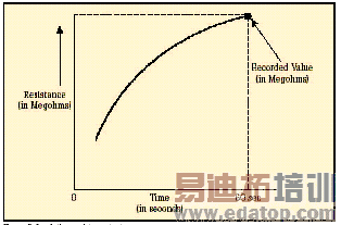 表2. 针对设备额定值的维护测试电压抽查读数/短时阻抗测试 在短时测试中,兆欧表被直接跨接在被测设备上,施加大约60秒的测试电压。为了在大约一分钟的时间内使绝缘值读数达到稳定,应该只对低容性的设备进行该项测试。基本的连接步骤和验证测试时相同,所施加的电压按DC测试电压公式进行计算。当测试好的设备时,您会注意到,随电容容量和吸收电流的降低,绝缘阻抗值会稳定上升。由于温度和湿度会影响测试结果,应该在标准温度(大约20C/68F)下、露点之上的环境下进行测试。 当设备的额定值等于或小于1000伏特时,绝缘读数应该为1MΩ或更高。当设备额定值高于1000伏特时,理想的阻抗应该为每1000伏特上升1MΩ。所测量的绝缘阻抗值通常会略低于以前记录的值,其下降的趋势规律如图6所示。绝缘值下降的斜率是绝缘材料老化程度的正常信号。陡峭的下降斜率是绝缘失效或可能出现故障的先兆。