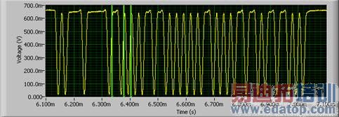 测试过程中,RFID阅读器协议一致性测试系统接收被测阅读器发送的指令,并测量特定脉冲的调制参数。实测信号如图5-9所示,被测阅读器采用的是PR-ASK信号,经过脉冲成型滤波后波形变得圆滑,数据位长度为24.8微秒,调制深度为97.4%,上升沿时间为8.0微秒,下降沿时间为7.6微秒,脉冲宽度为12.6微秒,符合协议规定。