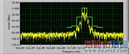 测试过程中,RFID阅读器协议一致性测试系统接收被测阅读器发送的指令,并计算一段Select指令的信号频谱,与标准的频谱模板进行比较。实测信号如图5-11所示,被测阅读器采用数据位长度25微秒的信号,相应信道宽度为100kHz,频谱未超出模板的限制,符合协议规定。