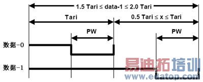 数据编码测试的目的是测量阅读器信号中的PIE编码参数,编码参数确定了阅读器信号数据位的标准长度,并间接确定了标签信号的链接速率。阅读器信号采用不同的脉冲长度进行数据信息的编码,数据0应在6.25到25微秒之间,数据1与数据0的长度之比,应满足如图5-6所示的规定: