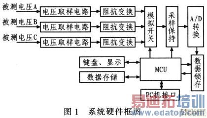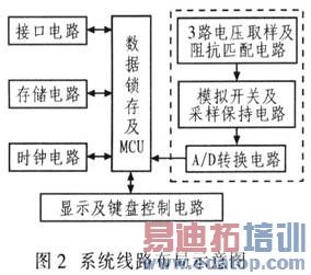 被测三相电压分别加到取样电路的输入端,信号按比例变换后,再经阻抗匹配网络,由16选1多路模拟开关,采样保持电路加到A/D转换的输入端。A/D转换后的数据经锁存后输入MCU,再由运算判断被测电压是否合格。同时,可将测量结果计入存储器件。MCU通过对时钟的操作,可实时将时间及测量结果显示在VFD上,通过键盘调整时钟。因系统中有存储器件,可将历史数据调出,在VFD显示。可将测量仪通过PC机接口与微机连接,在微机上集中操作、监控仪表。