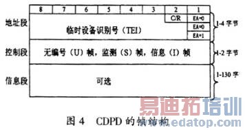 对等LLC实体间的信息传输是通过一序列的帧或LPDU来实现的,帧的一般结构如图4所示。地址段说明帧是命令或响 应(段C/R),并区分携带TEI值的帧的虚数据链路信道(换句话说,对点对点链路,它识别要接收的命令帧和发送响应帧),扩展地址(EA)段用于说明地址段的长度。