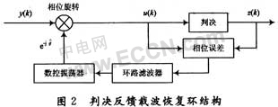 其中,ω0是载波频率偏差,θ0是固定相位偏差,Aj是相位抖动幅度,ωj是相位抖动频率,解调器需要消除这部分偏差。判决反馈载波恢复环可以消除载波相位误差。