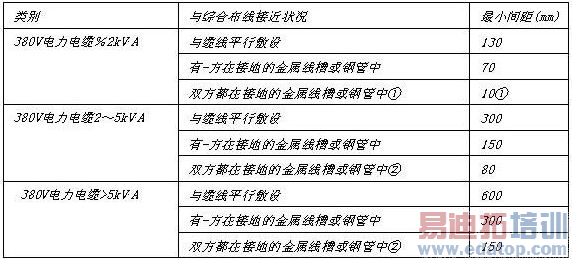 注:①当380V电力电缆<2kV?A,双方都在接地的线槽中,且平行长度≤10m时,最小间距可为10mm。