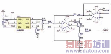系统对恒流源的要求是电流高度稳定,漂移和噪声足够小。采用高精度DAC作为恒压源,再通过V-I转换电路就构成了数字式恒流源,电路原理如图2所示。本系统采用美信公司的12位串行DAC MAX5812结合两个运放组成V-I转换电路。其中,MAX5812与单片机的通信采用串行I2C总线,需注意的是其SDA、SCL管脚在使用时要外接上拉电阻。
