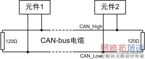 电信号在在电缆上传输时,当阻抗不连续或者发生突变时,就会发生信号反射。反射的过程十分的复杂,甚至可能发生多次反射,反射的信号叠加在正常的信号上,引起电平变化,导致数据传输出现错误。为了消减这种信号反射的方法,我们是使传输电缆上的阻抗保持连续,但是电缆总是有终点的,终点的阻抗是突变的,为了使终点阻抗保持连续,CAN-Bus规定要在电缆两端接入匹配电阻。这个终端电阻的阻值一般选用120Ω。如图 3所示。