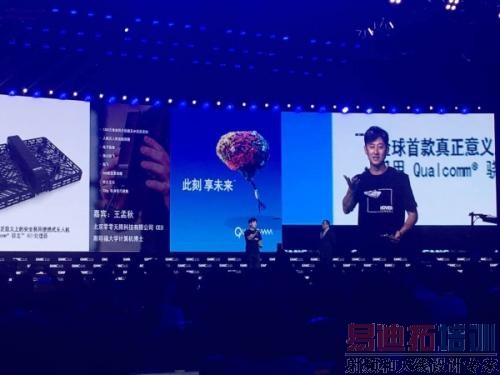 能够实现所有这一切,很重要的一个核心就是这块PCP,跑的SOC就是高通骁龙801,我们现在面临非常好的时代,得益于高通这样的领军企业把手机处理能力,以及单价成本都有该使得今天有机会在这么小设备跑人工智能,变成个人的机器人。我今天给大家展示一下。设计的体验和现在有的无人机都是不一样的,我给大家演示一下松手就会自主悬停,随时从空中抓下来。也可以抛飞,可以做到悬停。推也没问题,可以自己回来。我可以用手机连上WIFI,简单操控它,通过手的滑动简单操作。最重要的是现在这个状态就在自动跟踪我,当我在会场走动的时候可以确保我始终在画面的中间,如果往后退也会跟着我,往前进也会自己退。它上面跑的自主悬停,自动跟踪就是高级人工智能算法。我再展示一个很有意思的,一键360度拍全场环拍的视频,因为我的手机连上WIFI不会失去4G,所以我可以直接上传到微博等等任何地方。借这机会我数到三,我们一起拍照。借这个机会让悬停相机记住这个场景,拍一下大家,单指就可以控制云台,它有电子管像,画面非常稳,只要按这个键还是可以现场拍照。最后一键降落的功能。