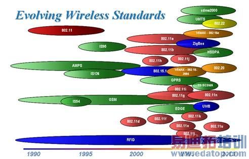 同时,各种无线通信标准的不断涌入也同样使人感到束手无策,每个公司和组织都在根据自己特定应用的需求来制定和优化不同的标准和协议,这就使得大量的新标准如雨后春笋般出现,而每个标准的生命周期却被大大的缩短。如果通过时间轴来显示各种标准,许多标准的演化过程会变得十分清晰,而新标准的开发也正以前所未有的速度进行着。如下图所示,在2000年之前,并存的标准只有四五种,并且生命力较长,到今天,这种情况已被层出不穷的各种标准所颠覆。