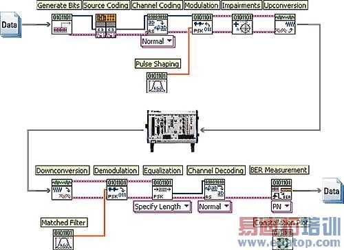 下图显示了National Instruments的LabVIEW图形化的语言和NI的PXI平台,通过软件无线电的方法再现了上述通讯系统的功能框图。模块化的硬件除了完成物理上的上下变频过程外,其余的功能都是通过软件来完成的。