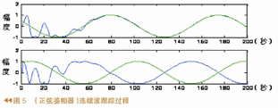 跟踪过程如图5所示。横坐标为时间,纵坐标为信号幅度。图5、6分别是利用正弦鉴相和反正切鉴相后,NCO的同相和正交输出,同相输出即为跟踪结果。对比可知,反正切鉴相时40s就可以实现正确跟踪,而正弦鉴相则要到80s才能实现。