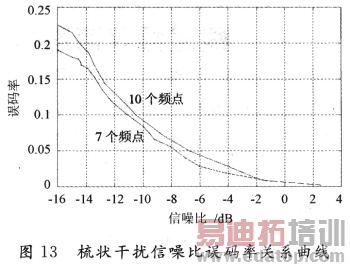 从图13上可以看出,对高速跳频通信系统而言,梳状干扰的影响远大于宽带干扰。梳状干扰的频点越多,所占的带宽就越大,跳频通信误码率越高,干扰效果越明显。