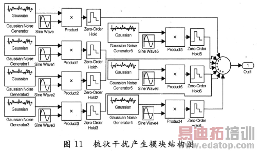 采用7个不同频率的正弦信号将7个高斯噪声调制后相加来模拟梳状干扰。模块图如图11所示。