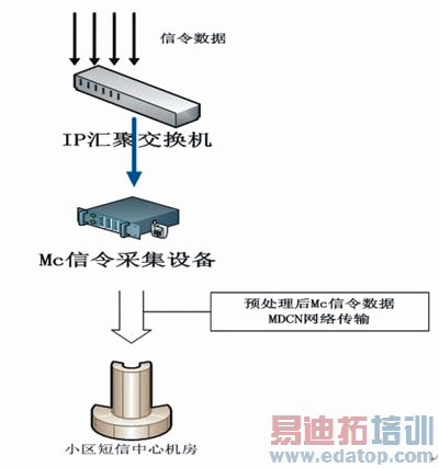 设计人员在软交换机房内对TAP汇聚后的Mc信令链路或者是交换机镜像的Mc信令链路接入到Ip信令汇聚交换机后,要用专门的信令采集设备进行信令数据采集。为节省MDCN网络传输带宽,建议将预处理后的信令数据传输到小区短信业务平台中心机房(如图3所示)。
